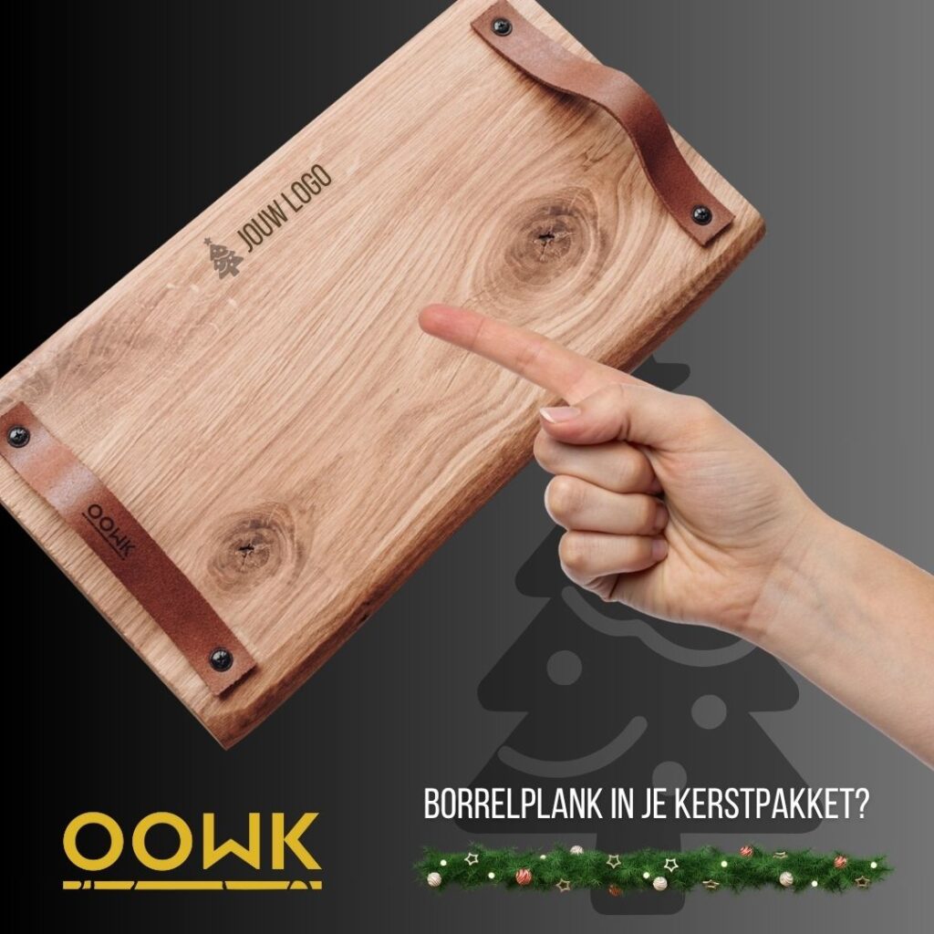 Geef dit jaar iets persoonlijks: een robuuste, eikenhouten borrelplank van OOWK. Met jouw logo, een persoonlijke boodschap of de naam van elke medewerker.